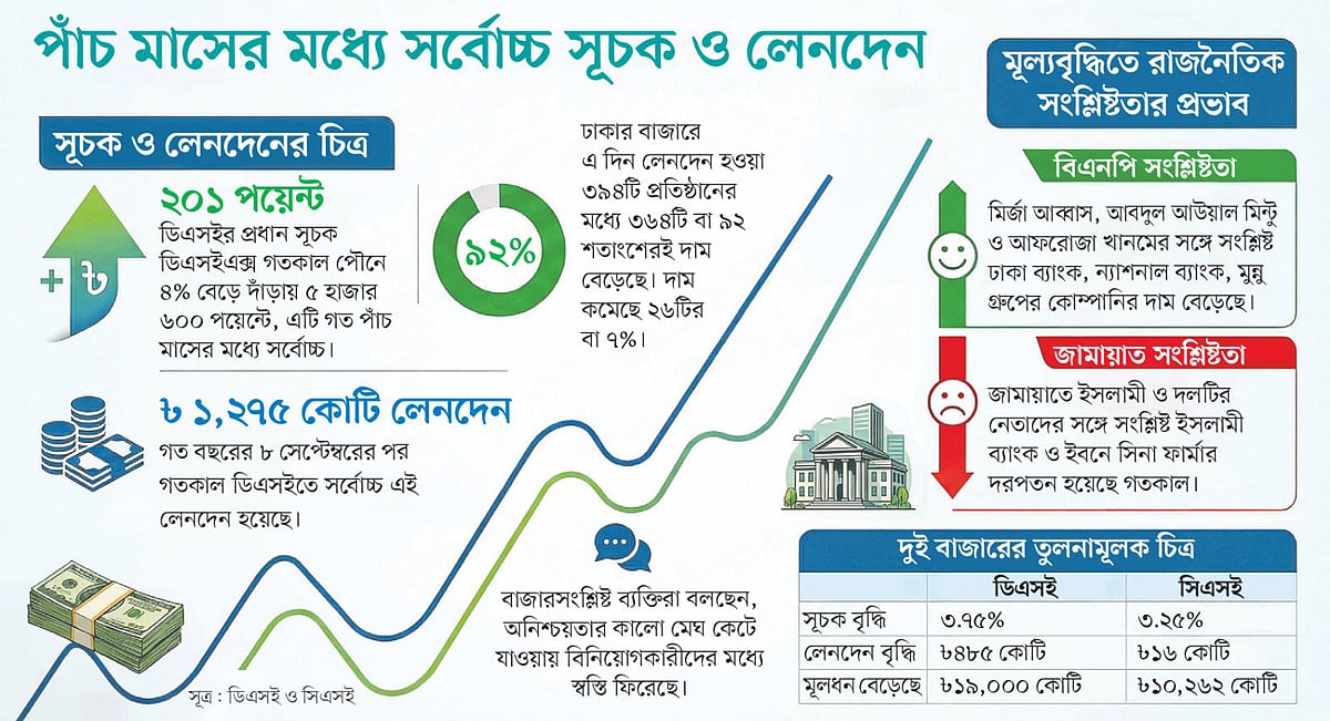 বাজার-সংশ্লিষ্ট ব্যক্তিরা বলছেন, নির্বাচন-পরবর্তী ফলাফলের সুস্পষ্ট একটি প্রভাব আজকের শেয়ারবাজারে পড়েছে। বিএনপির নিরঙ্কুশ জয়ে দলটির নেতা ও নির্বাচিত সংসদ সদস্যের মালিকানা বা সংশ্লিষ্টতা রয়েছে—তালিকাভুক্ত এমন কোম্পানির শেয়ারের প্রতি বিনিয়োগকারীদের বেশি আগ্রহ দেখা যাচ্ছে। আর জামায়াতে ইসলামীর নেতা ও নির্বাচিত সংসদ সদস্যের সংশ্লিষ্টতা রয়েছে—এমন কোম্পানির শেয়ারের দরপতন হয়েছে। এটি স্পষ্টত নির্বাচনী ফলাফলের একটি মনস্তাত্ত্বিক প্রভাব।