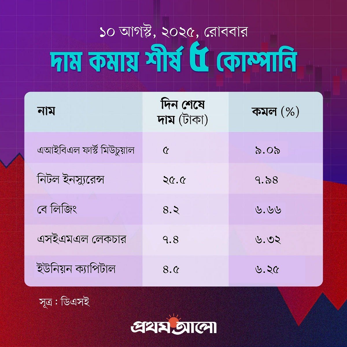 যে পাঁচ কোম্পানির শেয়ারের দাম সবচেয়ে বেশি কমল