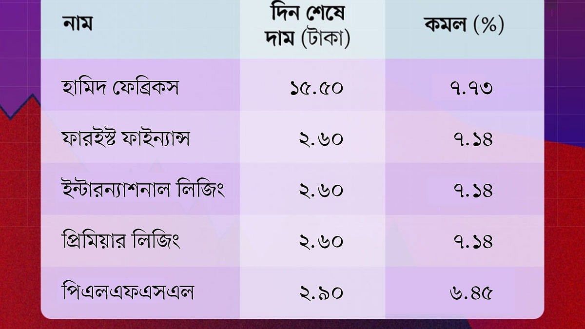 আজ দিন শেষে দাম বেড়েছে ১২০টি কোম্পানির শেয়ারের। কমেছে ২০৭টির ও অপরিবর্তিত আছে ৬২টি কোম্পানির শেয়ারের দাম। দেখে নেওয়া যাক, আজ মূল্যহ্রাসের শীর্ষে আছে কোন কোম্পানিগুলো।