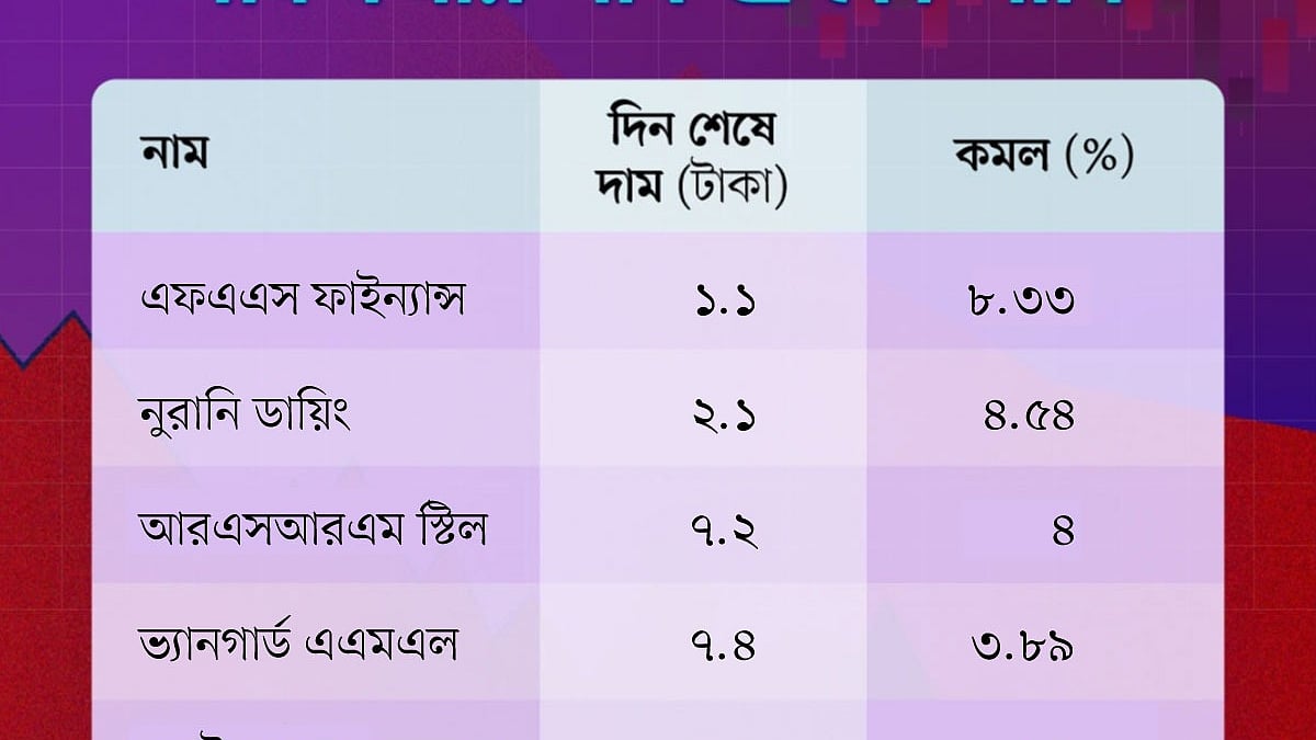 আজ মূল্যহ্রাসের শীর্ষে আছে এফএএস ফাইন্যান্স। আজ এই কোম্পানির শেয়ারের দাম ৮ দশমিক ৩৩ শতাংশ কমে ১ দশমিক ১০ টাকায় নেমে এসেছে। গতকাল এই শেয়ারের দাম ছিল ১ দশমিক ২০ টাকা।