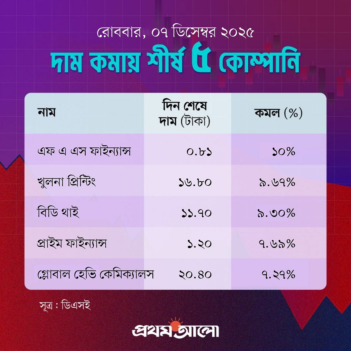 মূল্যহ্রাসের দিক থেকে আজ চতুর্থ স্থানে আছে প্রাইম ফাইন্যান্স। আজ এই শেয়ারের দাম কমেছে ৭ দশমিক ৬৯ শতাংশ। গত কার্যদিবসে এই কোম্পানির শেয়ারের দাম ছিল ১ টাকা ৩০ পয়সা। আজ দাম কমে হয়েছে ১ টাকা ২০ পয়সা।