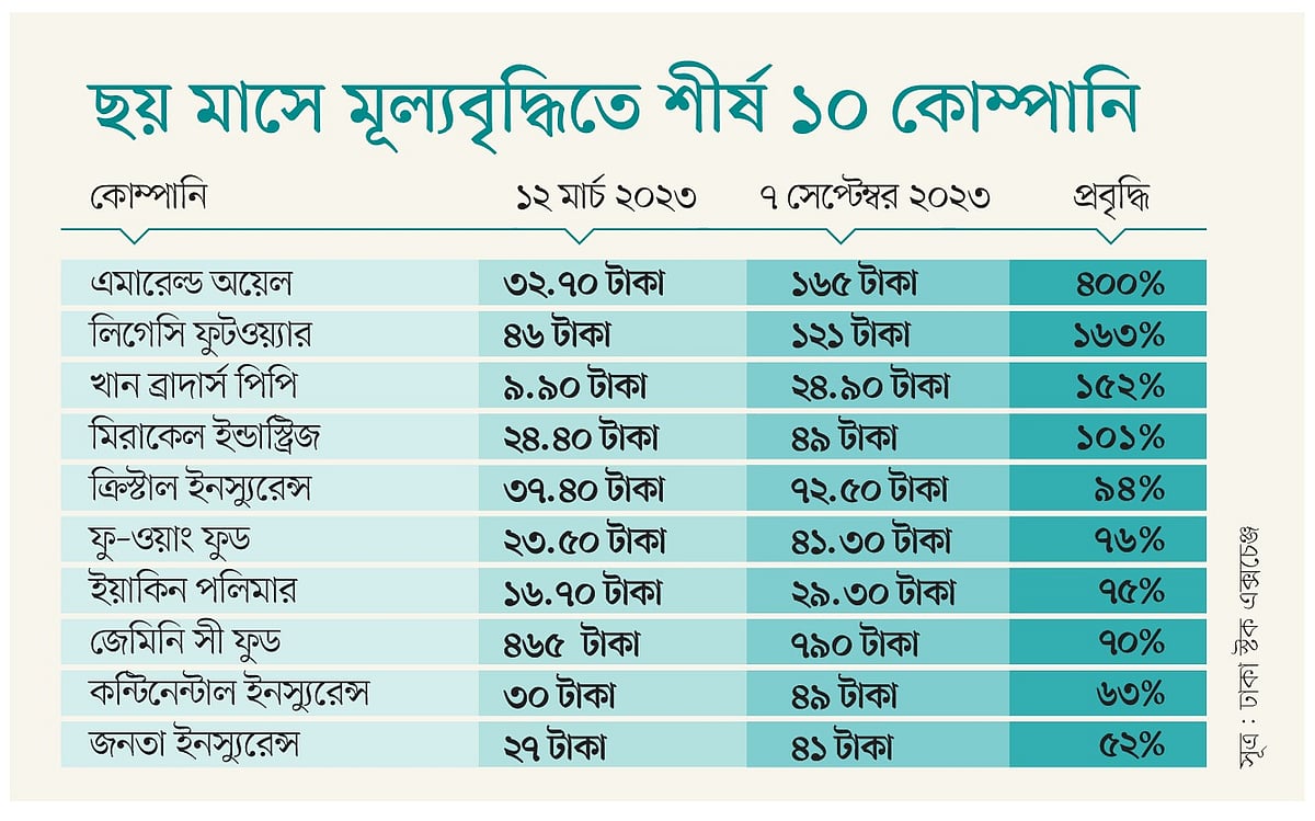 এ ছাড়া মূল্যবৃদ্ধিতে চতুর্থ অবস্থানে থাকা মিরাকেল ইন্ডাস্ট্রিজও একটি বন্ধ কোম্পানি। সেই কোম্পানির শেয়ারের দামও ছয় মাসে দ্বিগুণ হয়েছে।