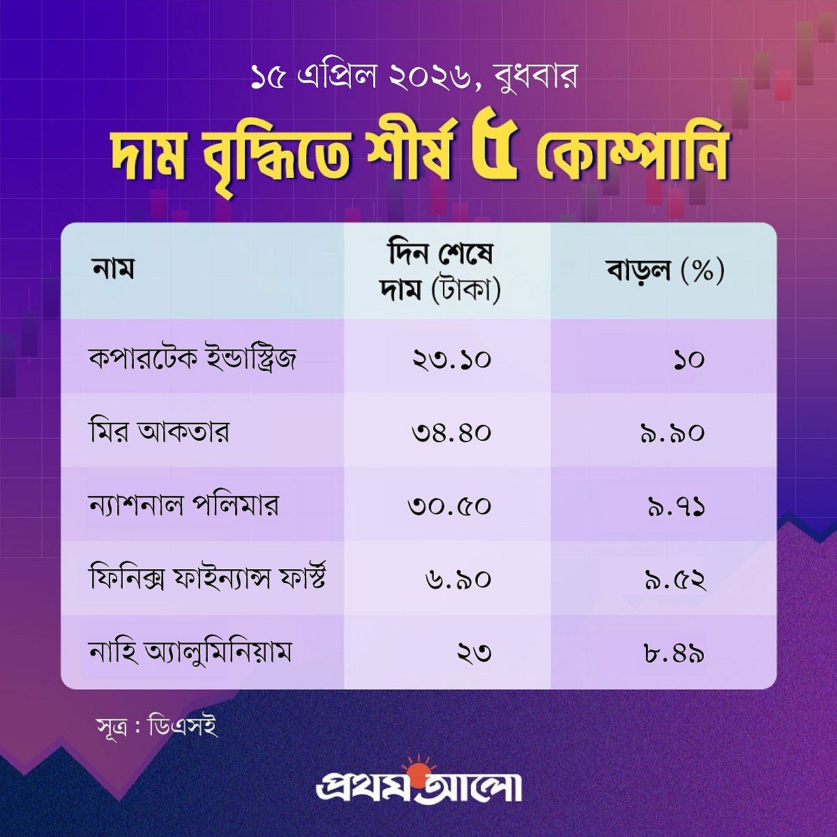 আজ দিন শেষে দাম বেড়েছে ২৩৯টি কোম্পানির শেয়ারের। কমেছে ৯০টির ও অপরিবর্তিত আছে ৬৪টি কোম্পানির শেয়ারের দাম। দেখে নেওয়া যাক, আজ মূল্যবৃদ্ধির শীর্ষে আছে কোন কোম্পানিগুলো।