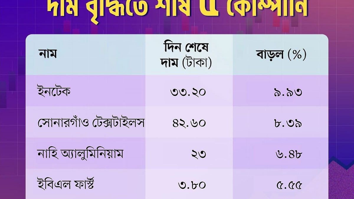 আজ দিন শেষে দাম বেড়েছে ১১৯টি কোম্পানির শেয়ারের। দাম কমেছে ২২১টি কোম্পানির শেয়ারের। অপরিবর্তিত আছে ৫৭টি কোম্পানির। দেখে নেওয়া যাক, আজ মূল্যবৃদ্ধির শীর্ষে আছে কোন কোম্পানিগুলো।