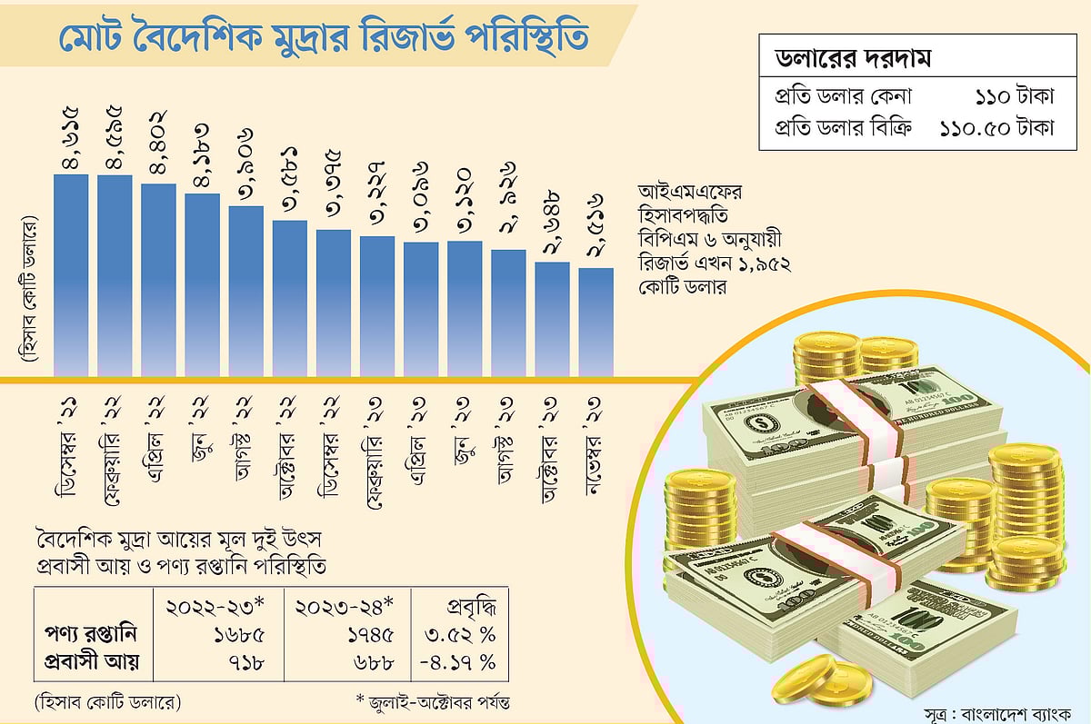 দেড় বছর ধরে চলা ডলার–সংকট এখনো কাটেনি। আমদানি নিয়ন্ত্রণের কারণে গত সেপ্টেম্বরে আমদানি খরচ কমে হয়েছে ৫২৭ কোটি ডলার, যা গত বছরের একই সময়ের তুলনায় প্রায় ২৭ শতাংশ কম। ব্যবসায়ীরা বলছেন, তাঁরা এখনো ঋণপত্র খুলতে চাহিদামতো ডলার পাচ্ছেন না। আবার অনেক উদ্যোক্তাকে ঘোষিত দামের চেয়ে ১২-১৩ টাকা বেশি দামে ডলার কিনতে হচ্ছে। এদিকে গত অক্টোবরে রপ্তানি আগের বছরের একই সময়ের তুলনায় সাড়ে ১৩ শতাংশ কমে হয়েছে ৩৭৬ কোটি ডলার। তবে গত মাসে প্রবাসী আয়ে প্রায় ৩০ শতাংশ প্রবৃদ্ধি হয়েছে, এসেছে ১৯৭ কোটি ডলার।