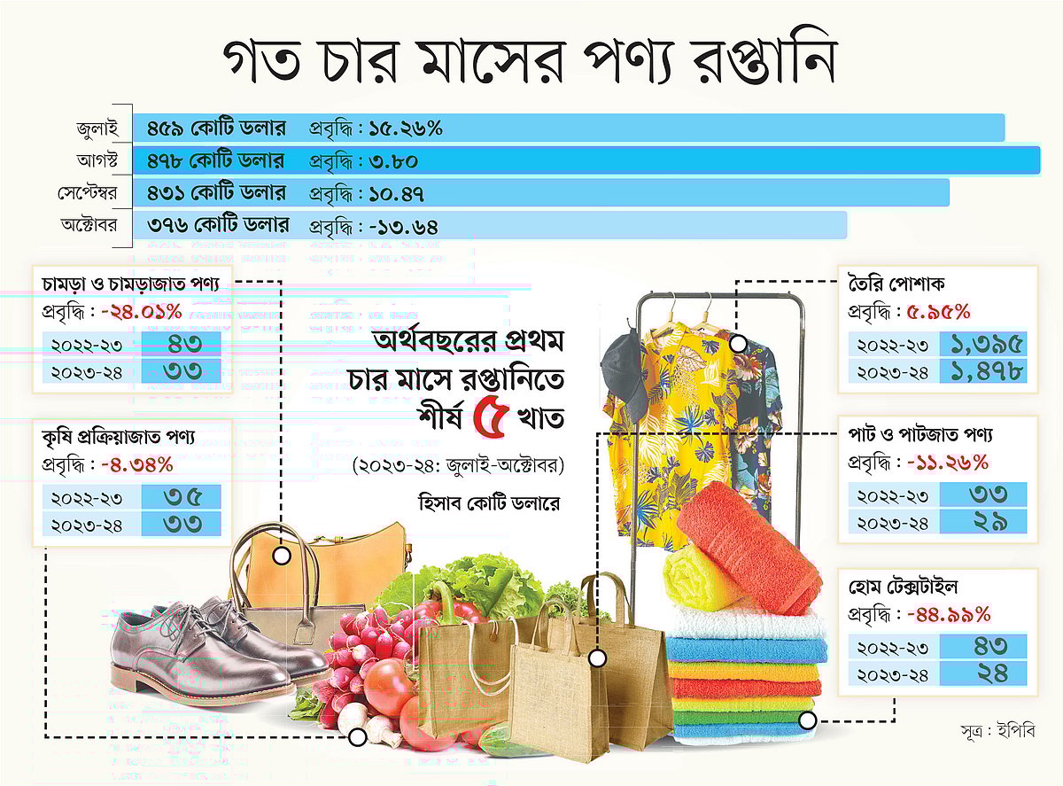 ইপিবির তথ্য বিশ্লেষণে দেখা যায়, চলতি অর্থবছরের প্রথম চার মাসে বড় খাতগুলোর মধ্যে তৈরি পোশাক রপ্তানি ইতিবাচক ধারায় আছে। অন্যদিকে হিমায়িত খাদ্য, চামড়া ও চামড়াজাত পণ্য, পাট ও পাটজাত পণ্য, কৃষি প্রক্রিয়াজাত পণ্য, হোম টেক্সটাইলের রপ্তানি কমেছে।
