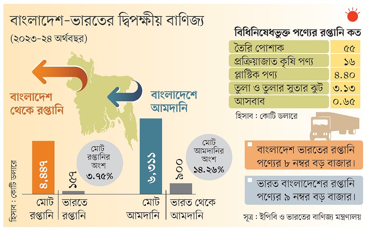 ইপিবির হিসাবে, বাংলাদেশ প্রায় সাড়ে চার হাজার কোটি ডলারের পণ্য রপ্তানি করে। এর মধ্যে ভারতে যায় মোট রপ্তানির ৩ দশমিক ৭৫ শতাংশ পণ্য। ভারত বাংলাদেশের শীর্ষ রপ্তানি গন্তব্যের মধ্যে ৯ নম্বর। অন্যদিকে ভারত থেকে বাংলাদেশ আমদানি করে প্রায় ৯০০ কোটি ডলারের পণ্য, যা মোট আমদানির ১৪ শতাংশের কিছু বেশি। ভারত থেকে শিল্পের কাঁচামাল বেশি আসে। দেশটির বাণিজ্য মন্ত্রণালয়ের তথ্য বলছে, ভারতের শীর্ষ ১০ রপ্তানি গন্তব্যের মধ্যে ৮ নম্বর বাংলাদেশ।