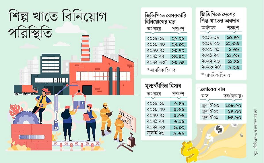 বাংলাদেশ পরিসংখ্যান ব্যুরোর (বিবিএস) তথ্য অনুসারে, ২০১৮-১৯ বছরে মোট দেশজ উৎপাদনে (জিডিপি) বেসরকারি বিনিয়োগ ছিল ২৫ দশমিক ২৫ শতাংশ। আর ২০২২-২৩ অর্থবছরে তা কমে দাঁড়ায় ২৩ দশমিক ৬৪ শতাংশে। অর্থাৎ পাঁচ বছরেও প্রবৃদ্ধি বাড়েনি।