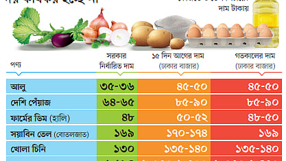 দুই সপ্তাহ আগে সরকার আলু, দেশি পেঁয়াজ ও ডিম—এই তিন পণ্যের দাম বেঁধে দিয়েছিল। এখনো বাজারে পেঁয়াজ ও আলুর দাম কার্যকর হয়নি। ডিমের দাম নির্ধারণ করা হয়েছিল বাজারের তখনকার দরের সামান্য কম। এখন কোনো কোনো বাজারে সেই দরে পাওয়া যাচ্ছে। তবে ছোট বাজার ও পাড়ার মুদিদোকানে বাড়তি দামেই ডিম বিক্রি হচ্ছে।