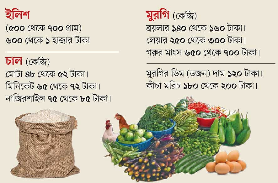 বাজারে ছোট আকারের রুই মাছের কেজি বিক্রি হচ্ছে ২৩০ থেকে ২৮০ টাকায়। বড় আকারের রুইয়ের কেজি পাওয়া যাচ্ছে ৩৫০ টাকার মধ্যে। চাষের কই বিক্রি হচ্ছে ২০০ থেকে ২৫০ টাকা কেজিতে। তেলাপিয়া ১৪০ থেকে ১৬০ টাকা, পাঙাশ ১৫০ থেকে ১৮০ টাকা, মাঝারি আকারের বাগদা চিংড়ি বিক্রি হচ্ছে ৬৫০ থেকে ৭০০ টাকা কেজি দরে।