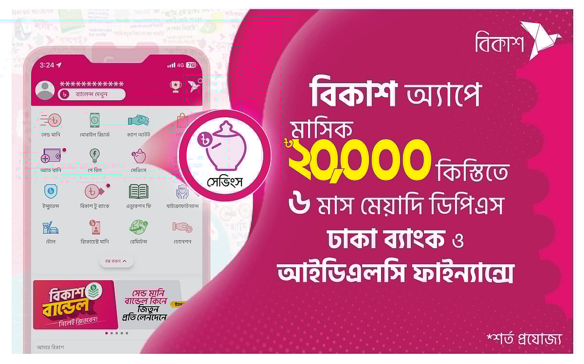 এক সংবাদ বিজ্ঞপ্তিতে এ তথ্য জানিয়েছে বিকাশ। প্রতিষ্ঠানটি বলেছে, বিকাশ অ্যাপ ব্যবহার করে ঢাকা ব্যাংক ও আইডিএলসি ফাইন্যান্সে ২০ হাজার টাকা মাসিক কিস্তিতে ডিপিএস খোলা যাবে। এর মেয়াদ হবে ছয় মাস।