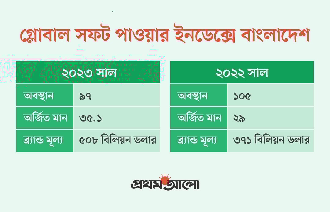 গ্লোবাল সফট পাওয়ার ইনডেক্সে দেখা যায়, ২০২৩ সালের র্যাঙ্কিংয়ে বাংলাদেশের অবস্থান ৯৭তম, এক বছর আগে যা ছিল ১০৫তম। ২০২২ সালে ১০০-এর মধ্যে বাংলাদেশের অর্জিত মান ছিল ২৯। পরের বছরে যা ৩৫ দশমিক ১-এ উঠেছে। অর্থাৎ, এক বছরে বাংলাদেশের অর্জিত মান বেড়েছে ৬ দশমিক ১।