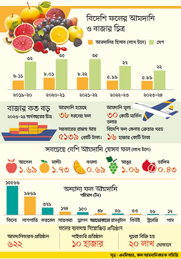 জাতীয় রাজস্ব বোর্ডের (এনবিআর) হিসাবে, ২০২২-২৩ অর্থবছরের তুলনায় ২০২৩-২৪ অর্থবছরে বিদেশি ফল আমদানি ১০ হাজার টন কমেছে। গত অর্থবছরে ফল আমদানি হয়েছে ৫ লাখ ৮৯ হাজার টন বা প্রায় ৬০ কোটি কেজি। ফলভেদে খুচরা গড় মূল্য হিসাবে এসব ফল কিনতে ক্রেতাদের খরচ হয়েছে ন্যূনতম ১৬ হাজার কোটি টাকা।