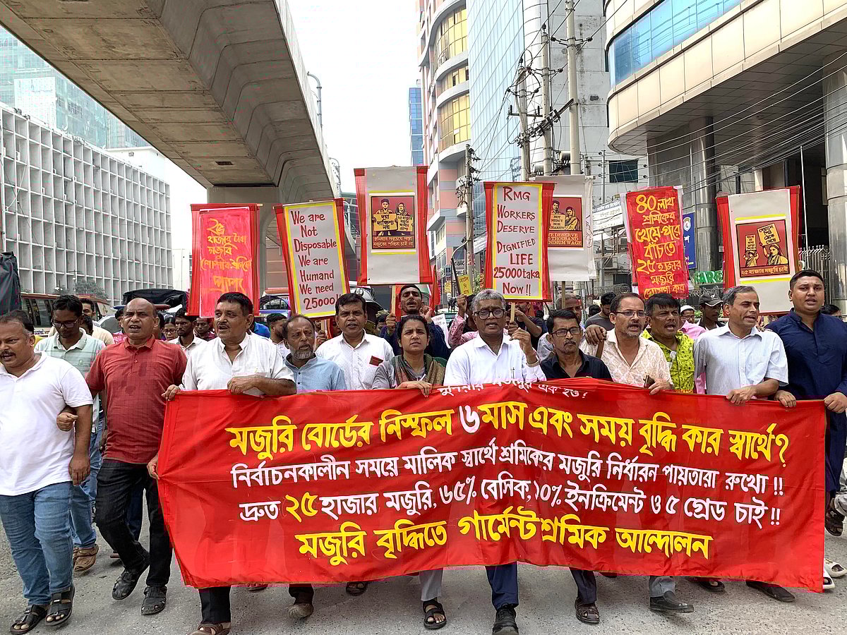 পোশাকশিল্পের শ্রমিকদের মজুরি পুনর্নির্ধারণের জন্য গঠিত নিম্নতম মজুরি বোর্ডের ছয় মাস পূর্ণ হওয়ার দিনে আজ মঙ্গলবার মজুরি বৃদ্ধির দাবিতে গার্মেন্ট শ্রমিক আন্দোলনের নেতারা জাতীয় প্রেসক্লাবের সামনে সমাবেশ করেন। ১১টি শ্রমিক সংগঠন পোশাকশিল্পের শ্রমিকদের মজুরি বৃদ্ধির দাবিতে গার্মেন্ট শ্রমিক আন্দোলন নামের এই জোট গঠন করে।