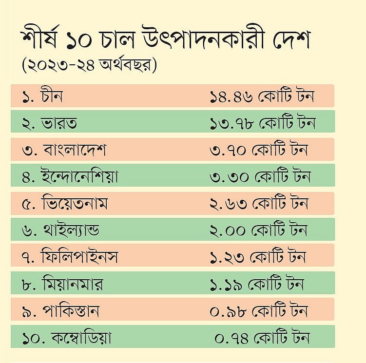 গত অর্থবছর বিশ্বের মোট উৎপাদিত চালের ২৮ শতাংশ উৎপাদন হয়েছে চীনে। পরিমাণ ১৪ কোটি ৪৬ লাখ টন। যদিও ২০২২–২৩ অর্থবছরের তুলনায় গত অর্থবছর চীনের চাল উৎপাদন কমেছে দশমিক ৯১ শতাংশ। এদিকে গত অর্থবছর ভারতে দ্বিতীয় সর্বোচ্চ ১৩ কোটি ৭৮ লাখ টন চাল উৎপাদন হয়, যা বিশ্বের মোট উৎপাদিত চালের ২৬ শতাংশ।