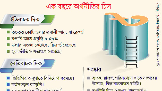 প্রবাসী আয় ও রপ্তানি আয় ছাড়া বাকি সব সূচক ছিল নিম্নমুখী। অনেকটাই বিকল ও ভগ্নদশার একটি অর্থনীতি পায় বর্তমান অন্তর্বর্তীকালীন সরকার।