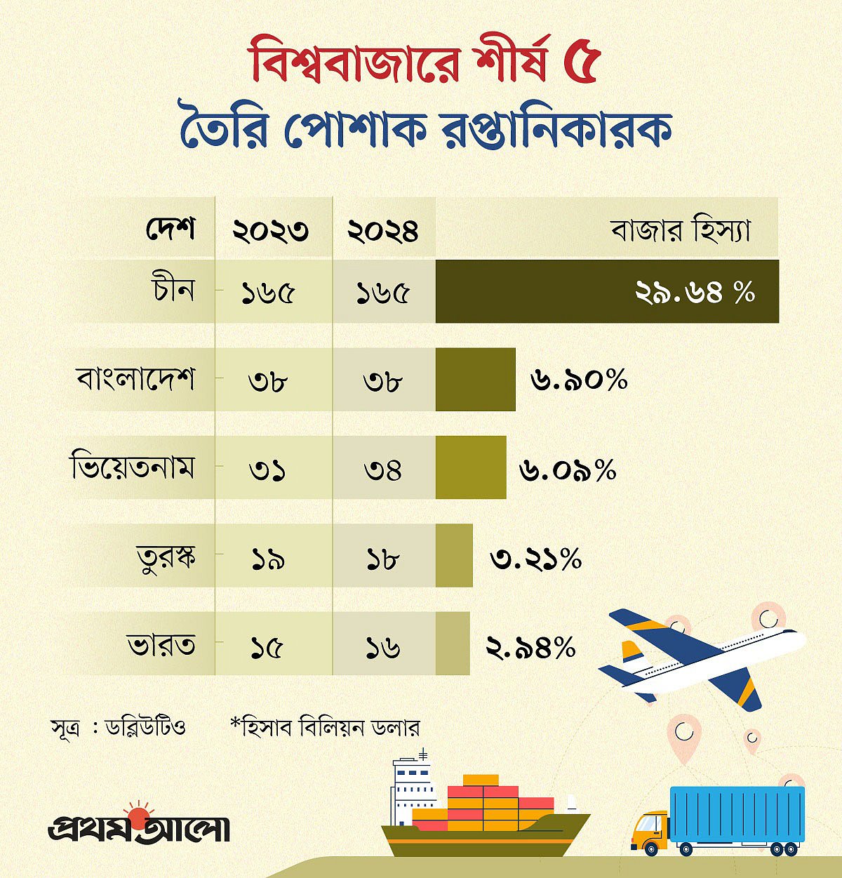 দেশি-বিদেশি চ্যালেঞ্জের মধ্যে একক দেশ হিসেবে গত বছরও বিশ্ববাজারে তৈরি পোশাক রপ্তানিতে দ্বিতীয় শীর্ষ অবস্থান ধরে রেখেছে বাংলাদেশ। যদিও বাজার হিস্যা দশমিক ৪৮ শতাংশীয় পয়েন্ট কমে গেছে। বাংলাদেশের পর তৃতীয় অবস্থানে আছে ভিয়েতনাম। আর শীর্ষ অবস্থানে আছে বরাবরের মতো চীন। যদিও তাদের বাজার হিস্যা ২ শতাংশীয় পয়েন্ট কমে গেছে।