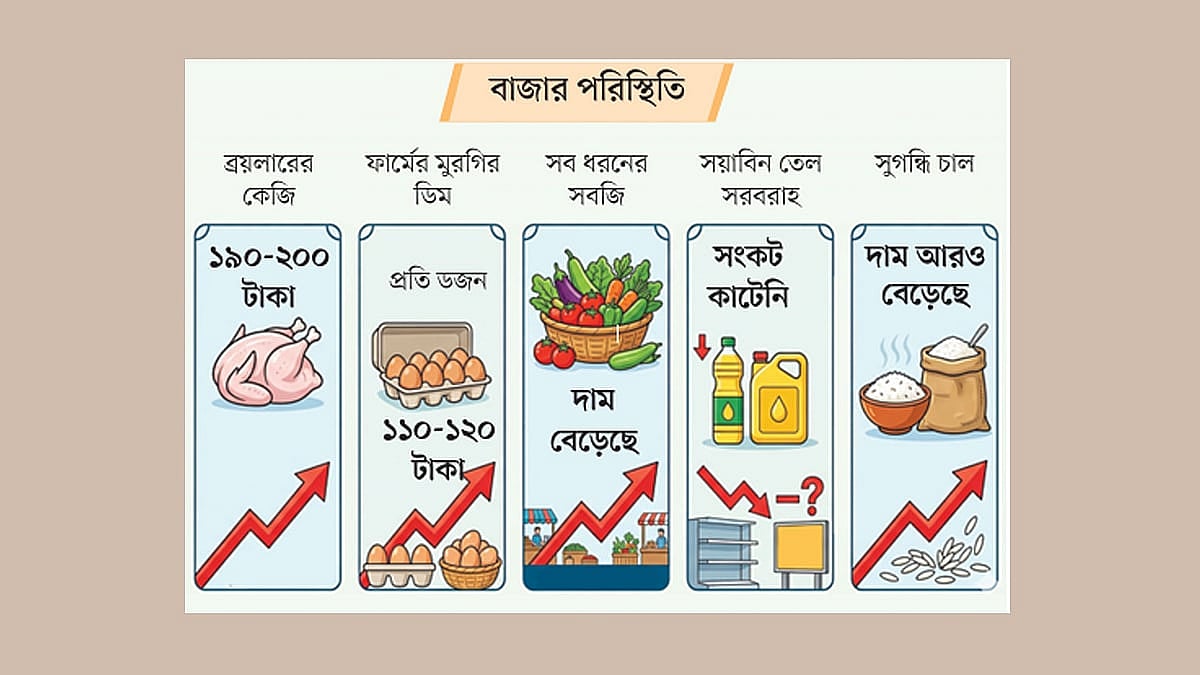 গতকাল রাজধানীর বাজারগুলোতে প্রতি কেজি সোনালি মুরগি ৩৮০-৩৯০ টাকায় বিক্রি হয়েছে। হাইব্রিড সোনালি বিক্রি হয়েছে ৩৫০-৩৬০ টাকায়। দাম বাড়ার পর গতকাল এক ডজন ডিম বিক্রি হয়েছে ১১০-১২০ টাকায়। বাজারে সবচেয়ে বেশি দাম কাঁকরোলের; কেজি ১২০-১৪০ টাকা। এ ছাড়া বরবটি, পটোল, করলা, চিচিঙ্গা, ঝিঙে, বেগুন প্রভৃতি সবজির দাম ৮০ টাকা বা তার চেয়ে বেশি। আগে প্রতিটি লাউ ৪০-৬০ টাকায় কেনা যেত, যা এখন ৬০ থেকে ৮০ টাকা হয়েছে।