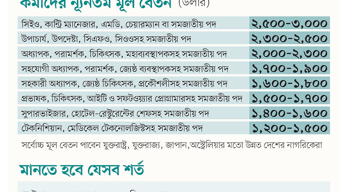 বিদেশি প্রতিষ্ঠানের শীর্ষ পদে কর্মরত বিদেশিদের ক্ষেত্রে যুক্তরাষ্ট্র, যুক্তরাজ্য, জাপান, অস্ট্রেলিয়া, সিঙ্গাপুর, সংযুক্ত আরব আমিরাত, সৌদি আরব, নিউজিল্যান্ড ও ইউরোপীয় ইউনিয়নভুক্ত দেশ ও উন্নত বিশ্বের অন্যান্য দেশের নাগরিকের ক্ষেত্রে ন্যূনতম মূল বেতন হবে ৩ হাজার ডলার। মালয়েশিয়া, চীন, থাইল্যান্ড, হংকং, দক্ষিণ কোরিয়া, দক্ষিণ আফ্রিকাসহ একই মানের দেশের নাগরিকদের কেউ যদি বিদেশি প্রতিষ্ঠানের শীর্ষ পদে দায়িত্ব পালন করেন, তাঁদের ক্ষেত্রে ন্যূনতম মূল বেতন হবে ২ হাজার ৮০০ ডলার। আর দক্ষিণ এশিয়ার দেশ মিয়ানমার, ইন্দোনেশিয়াসহ তৃতীয় বিশ্বের দেশের নাগরিকের ক্ষেত্রে ন্যূনতম এ বেতন হবে আড়াই হাজার ডলার।