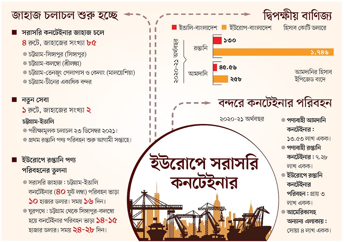 চট্টগ্রাম-ইতালি সরাসরি জাহাজ সেবা চালু হচ্ছে। এতে ব্যবসায়ীদের খরচ কমবে ৩০ শতাংশ ও সময় বাঁচবে এক থেকে দুই সপ্তাহ।