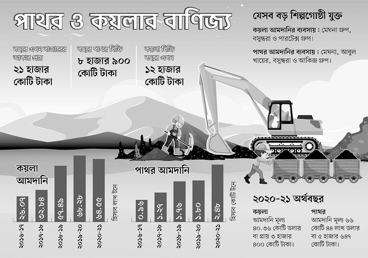 আবার গত অর্থবছরে কয়লা আমদানি হয়েছে ৬৪ লাখ টন। দেশ ও মানভেদে গত বছর দেশের বাজারে কয়লার দাম ছিল টনপ্রতি গড়ে ৯ হাজার টাকা। বিশ্ববাজার অস্থিতিশীল হওয়ায় দেশেও কয়লার দাম বেড়েছে। দাম বেড়ে এখন প্রতি টন বিক্রি হচ্ছে গড়ে ১৯ হাজার টাকায়। সেই হিসাবে দেশে কয়লার বাজারের আকার বেড়ে হয়েছে ১২ হাজার কোটি টাকার। পাঁচ বছর আগেও কয়লার বাজারের আকার ছিল প্রায় আড়াই হাজার কোটি টাকার। দেশে পাথর ও কয়লার বাজার বেড়ে দাঁড়িয়েছে প্রায় ২১ হাজার কোটি টাকা।