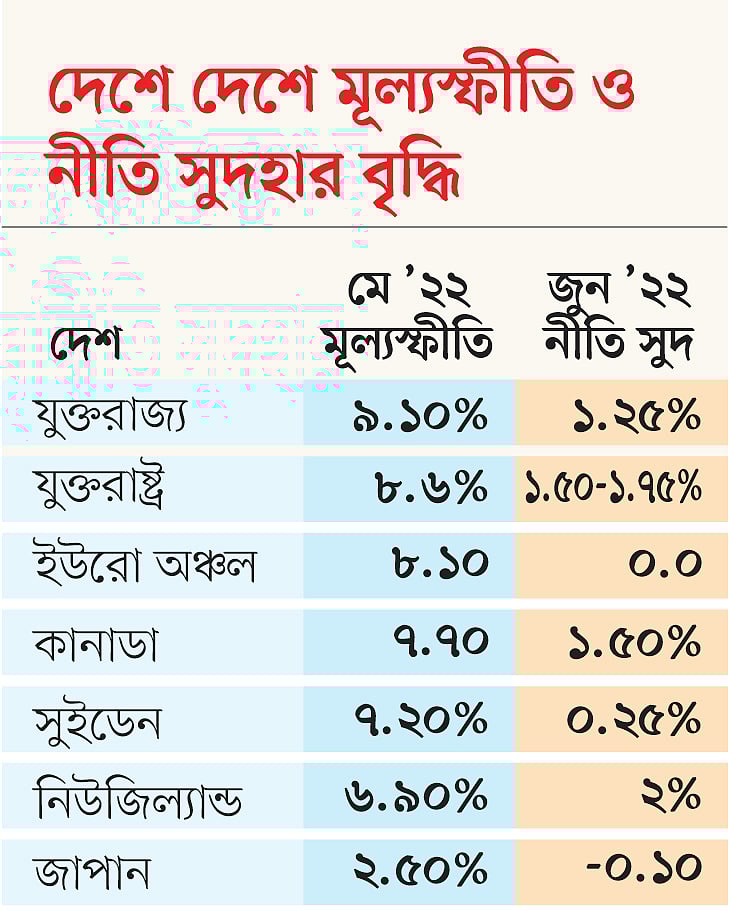 তবে বিশ্ব অর্থনীতি এর মধ্যেই ঘুরে দাঁড়াচ্ছিল, কিন্তু তখনই শুরু হয় রাশিয়া-ইউক্রেন যুদ্ধ। ফলে দেশে দেশে মূল্যস্ফীতি রেকর্ড উচ্চতায় উঠেছে। এই বাস্তবতায় কেন্দ্রীয় ব্যাংকের হাতে একটি অস্ত্র আছে—নীতি সুদহার বৃদ্ধি। বিশ্বের প্রায় সব বড় দেশের কেন্দ্রীয় ব্যাংক গত কয়েক মাসে নীতি সুদহার বৃদ্ধি করেছে। কিন্তু উন্নত দেশে নীতি সুদহার বৃদ্ধির নেতিবাচক প্রভাব পড়ছে উন্নয়নশীল দেশগুলোতে।