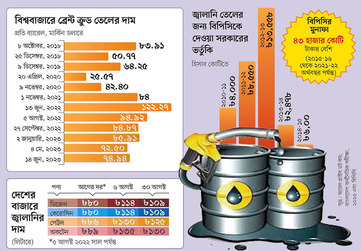 ২০২১ সালের নভেম্বরে দীর্ঘদিন পর জ্বালানি তেলের দাম বাড়ায় সরকার। তখন আন্তর্জাতিক বাজারে অপরিশোধিত জ্বালানি তেলের অন্যতম মানদণ্ড ব্রেন্ট ক্রুডের ব্যারেলপ্রতি দাম ছিল ৮৪ মার্কিন ডলার।