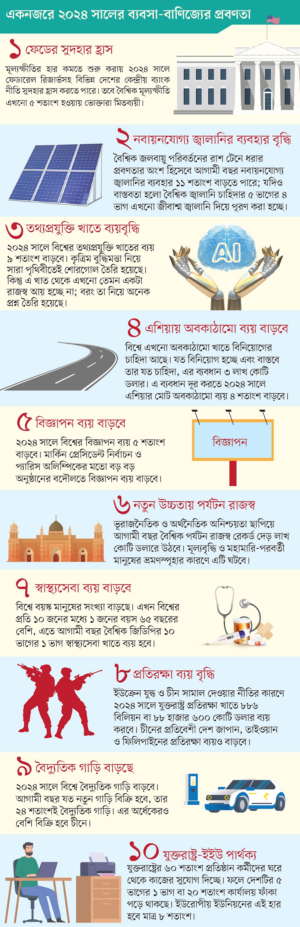 তবে অনেক বিশ্লেষক এখন আশা করছেন, ২০২৪ সালে বিশ্ব অর্থনীতি ঘুরে দাঁড়াতে শুরু করবে। এদিকে গত কয়েক বছরের প্রেক্ষাপটে বিশ্ব অর্থনীতি কোথায় দাঁড়িয়ে আছে এবং ২০২৪ সালেই-বা কী হতে পারে, তা নিয়ে খাতভিত্তিক বিস্তারিত প্রতিবেদন প্রকাশ করেছে ব্রিটিশ সাময়িকী দ্য ইকোনমিস্ট। দেখে নেওয়া যাক তারা কী কী পূর্বাভাস দিয়েছে।