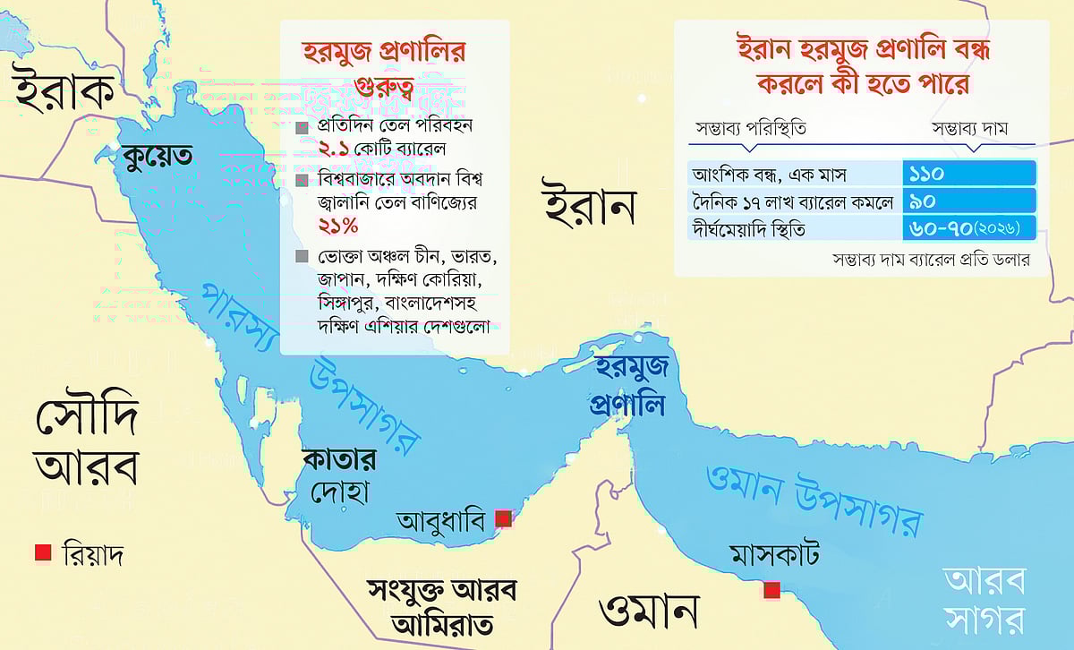 ইসরায়েল–ইরান সংঘাতে যুক্তরাষ্ট্র জড়িয়ে পড়ায় পরিস্থিতির আরও অবনতি হয়েছে। ইরানের সংসদে ইতিমধ্যে হরমুজ প্রণালি বন্ধের সিদ্ধান্ত হয়েছে, যদিও চূড়ান্ত সিদ্ধান্ত নেওয়ার ভার দেশটির নিরাপত্তা কাউন্সিলের। বিশ্লেষকেরা বলছেন, ইরান হরমুজ প্রণালি অবরোধ করলে বিশ্ববাজারে তেলের দাম অনেকটাই বেড়ে যাবে। এই সংঘাত শুরু হওয়ার পর বিশ্ববাজারে জ্বালানি তেলের অন্যতম মানদণ্ড ব্রেন্ট ক্রুডের দাম প্রতিদিনই কিছু কিছু না বাড়ছে। খবর বিবিসি, আল–জাজিরা, রয়টার্সের।