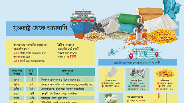 যুক্তরাষ্ট্র থেকে বাংলাদেশ নেহাত কম পণ্য আমদানি করে না। সে দেশ থেকে বাংলাদেশ ২ হাজার ৫১৫ ক্যাটাগরির পণ্য আমদানি করে থাকে। এর মধ্যে যুক্তরাষ্ট্রের ৫০টি রপ্তানি পণ্যের শীর্ষ ১০ গন্তব্যের একটি হলো বাংলাদেশ। যুক্তরাষ্ট্রের ইন্টারন্যাশনাল ট্রেড কমিশনের তথ্য পর্যালোচনা করে এই চিত্র পেয়েছে প্রথম আলো।