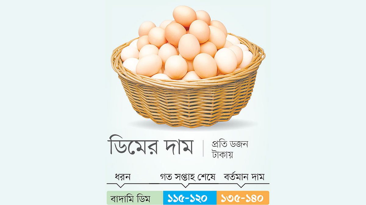 গতকাল মঙ্গলবার ডিমের পাইকারি ও খুচরা ব্যবসায়ীদের সঙ্গে কথা বলে জানা গেছে, রাজধানীর বিভিন্ন বাজার ও পাড়ামহল্লার দোকানে প্রতি ডজন বাদামি ডিম বিক্রি হচ্ছে ১৩৫ থেকে ১৪০ টাকায়। গত সপ্তাহের শেষেও এই ডিম বিক্রি হয়েছিল ১১৫ থেকে ১২০ টাকায়। অর্থাৎ, এক সপ্তাহেরও কম সময়ের ব্যবধানে প্রতি ডজন ডিমের দাম ২০ টাকা বেড়েছে। তবে সাদা ডিম ডজনপ্রতি ১০ টাকা কমে বিক্রি হচ্ছে। ব্যবসায়ীরা জানান, বাজারে ডিমের সরবরাহ এখনো কম।