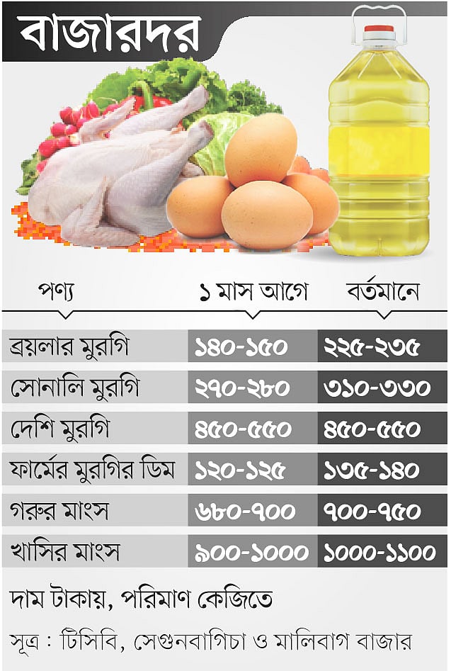 বাজারে মুরগির মাংস ছাড়াও সব ধরনের মাংসের দামই বাড়তি। গরুর মাংস বিক্রি হচ্ছে প্রতি কেজি ৭০০ থেকে ৭৫০ টাকায়; আর খাসির মাংস ১ হাজার থেকে ১ হাজার ১০০ টাকায়।