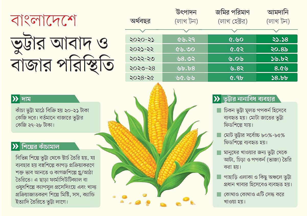 দেশে বছর বছর বাড়ছে ভুট্টার উৎপাদন। মূলত ধানের চেয়ে দাম বেশি পাওয়ায় ভুট্টা চাষে আগ্রহ বাড়ছে কৃষকের। তা ছাড়া ভুট্টা আবাদে পানি ও কীটনাশক লাগে কম। স্বল্প পরিচর্যায় উচ্চ ফলনের কারণে দেশের উত্তরাঞ্চলে ভুট্টার জনপ্রিয়তা দিন দিন বাড়ছে। এতে পশুখাদ্য তৈরির অপরিহার্য এ উপাদানের আমদানিও কমছে। দেশের উৎপাদিত ভুট্টার ওপর নির্ভর করে গড়ে উঠেছে ৮০ হাজার কোটি টাকার প্রাণিখাদ্য বা ফিডশিল্প।