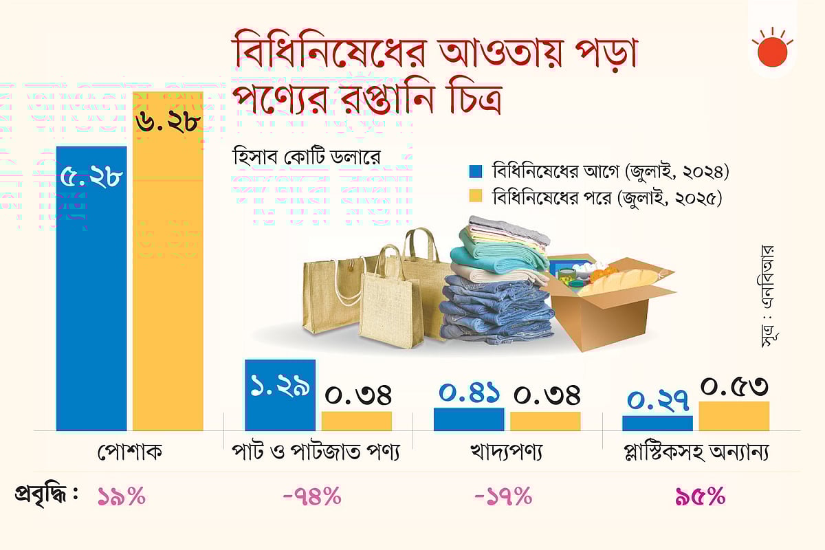 ভারত নানা রকম বিধিনিষেধ আরোপ করার পরও দেশটিতে গত জুলাই মাসে বাংলাদেশের রপ্তানি আয় বেড়েছে। তবে একেক খাতের অবস্থা একেক রকম। তৈরি পোশাক, প্লাস্টিকসহ কয়েকটি পণ্যের রপ্তানি বেড়েছে। অন্যদিকে অনেকটাই কমেছে পাট ও পাটজাত পণ্য এবং খাদ্যপণ্য রপ্তানি।