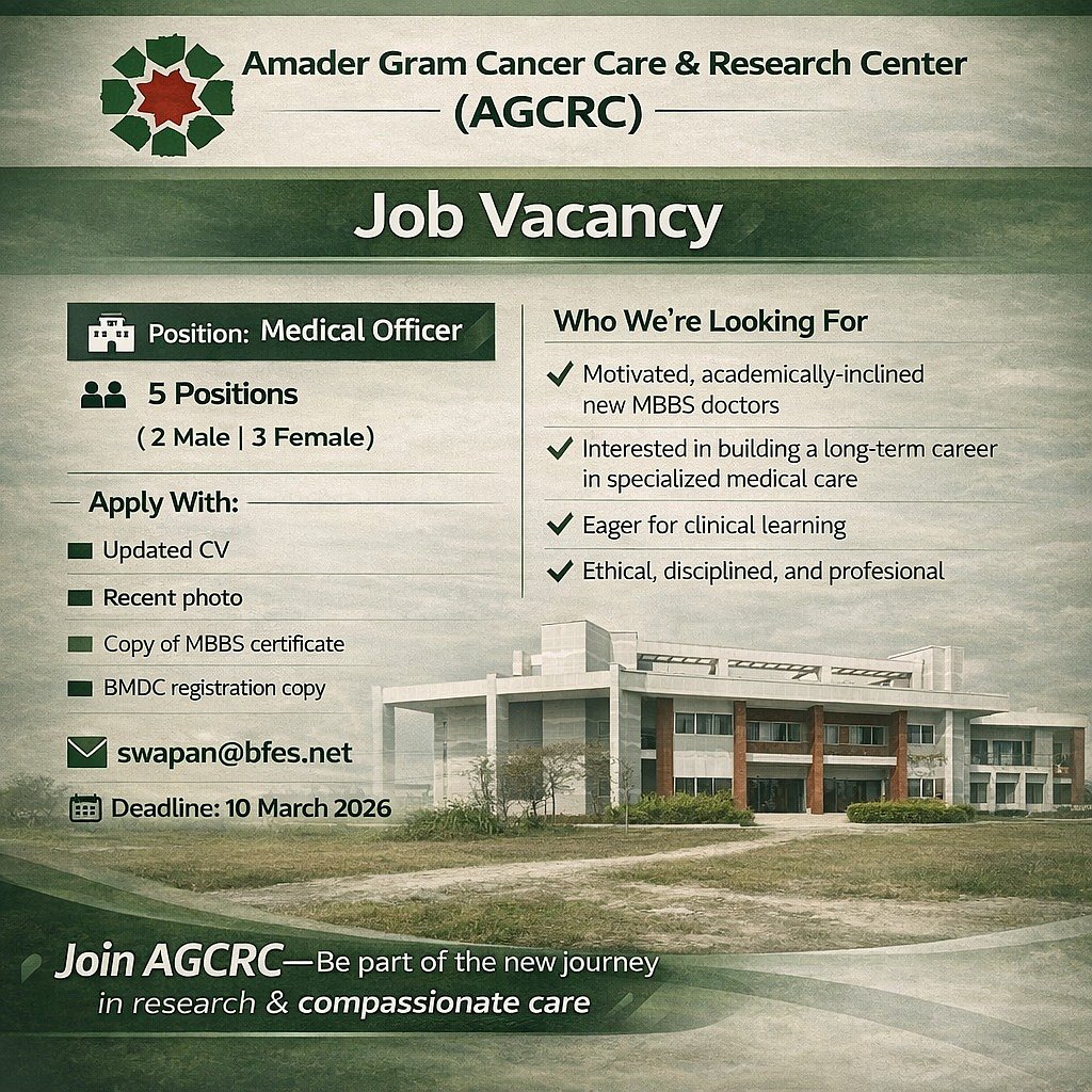 আমাদের গ্রাম ক্যানসার কেয়ার অ্যান্ড রিসার্চ সেন্টারে মেডিক্যাল অফিসার পদে নিয়োগ বিজ্ঞপ্তি প্রকাশ করা হয়েছে। মোট পদসংখ্যা ৫। আবেদনের শেষ তারিখ ১০ মার্চ ২০২৬।