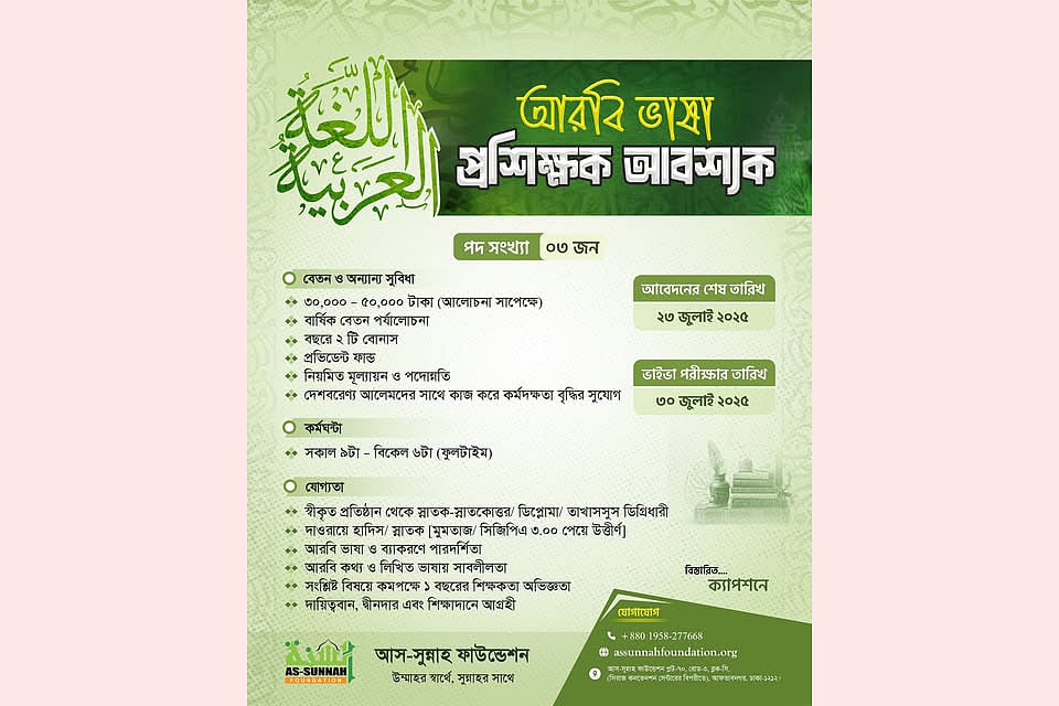 বিশ্ববিদ্যালয়পড়ুয়া (জেনারেল) শিক্ষার্থীদের আরবি ভাষা শিক্ষাদানের লক্ষ্যে আস–সুন্নাহ ফাউন্ডেশন একটি পদে যোগ্য, অভিজ্ঞ ও নিবেদিতপ্রাণ প্রশিক্ষক নিয়োগ দেবে।