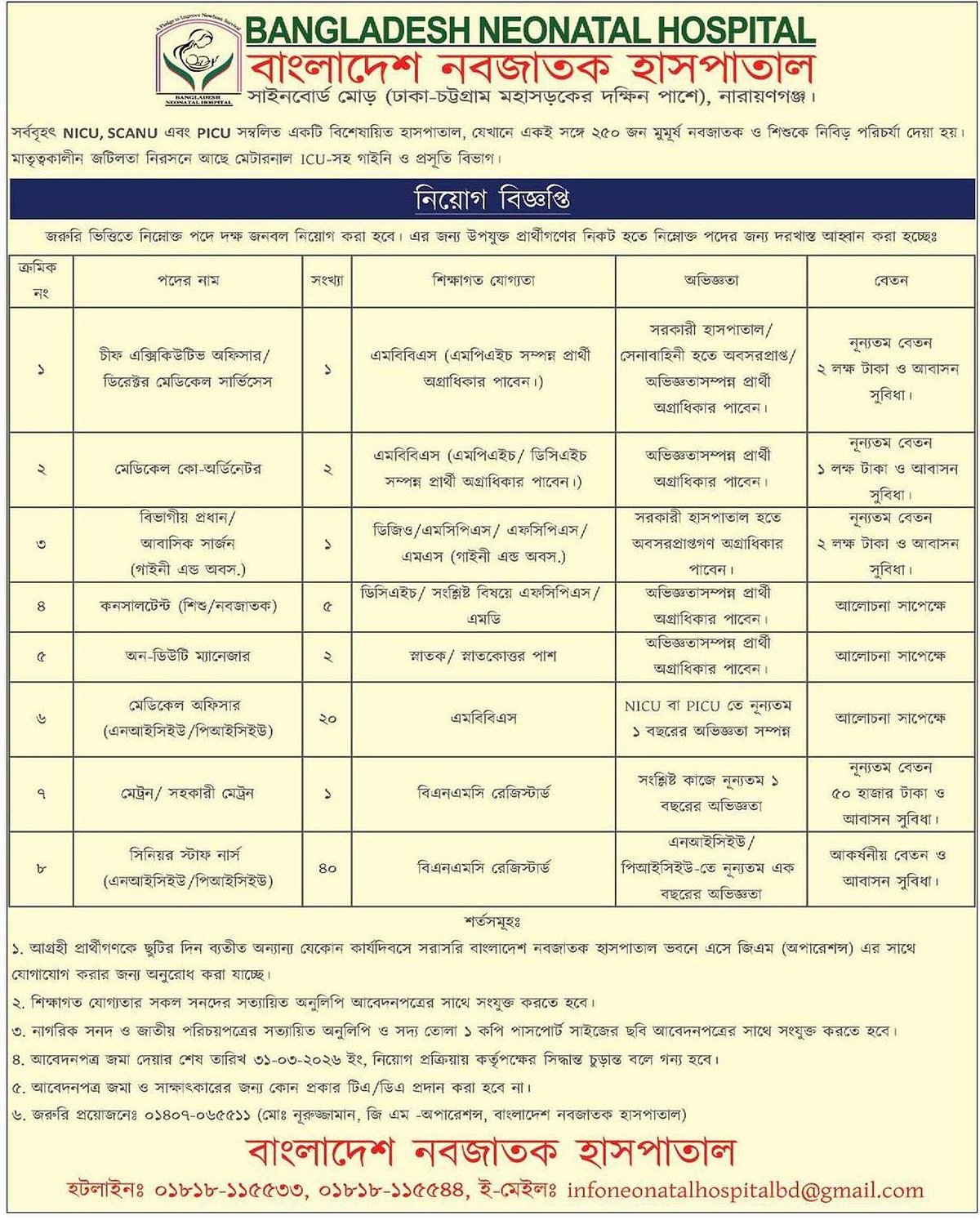 শিক্ষাগত যোগ্যতা ও অভিজ্ঞতা: বিএনএমসি রেজিস্টার্ড। এনআইসিইউ/পিআইসিইউতে ন্যূনতম এক বছরের অভিজ্ঞতা।