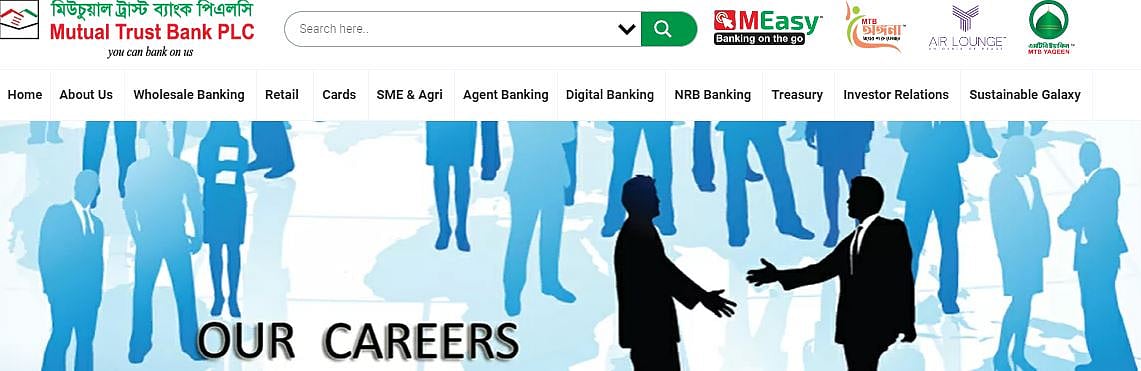 অ্যাসিস্ট্যান্ট ম্যানেজার বা অ্যাসোসিয়েট ম্যানেজার পদে জনবল নিয়োগ দেবে বেসরকারি মিউচুয়াল ট্রাস্ট ব্যাংক পিএলসি (এমটিবি)। ব্যাংকের আইটি সার্ভিস ম্যানেজমেন্ট বিভাগে এ নিয়োগ দেওয়া হবে। আজ সোমবার (০১ জানুয়ারি) থেকে আবেদন করতে পারছেন আগ্রহী প্রার্থীরা। আবেদন করা যাবে ১০ জানুয়ারি পর্যন্ত। আগ্রহী প্রার্থীরা অনলাইনে আবেদন করতে পারবেন। নির্বাচিত প্রার্থীরা মাসিক বেতন ছাড়াও প্রতিষ্ঠানের নীতিমালা অনুযায়ী বিভিন্ন সুযোগ-সুবিধা পাবেন। অ্যাসিস্ট্যান্ট ম্যানেজার বা অ্যাসোসিয়েট ম্যানেজার পদে কতজন নিয়োগ পাবেন তা নির্ধারিত নয়।