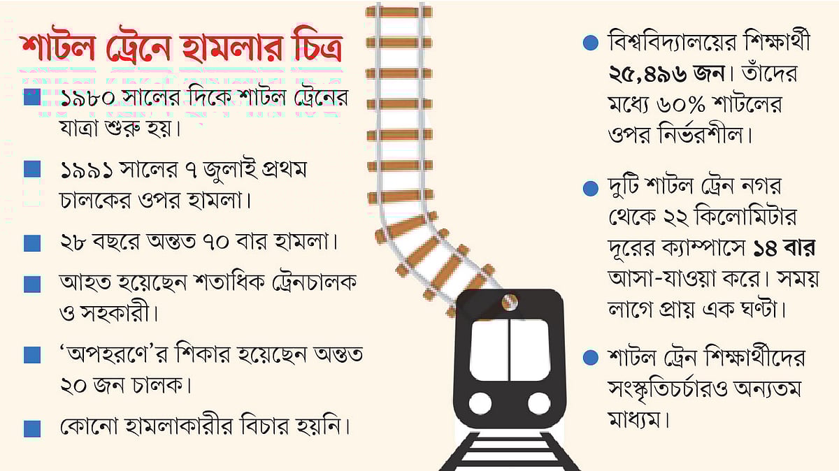 ১৯৮০ সালের দিকে শাটল ট্রেনের যাত্রা শুরু। ১৯৯১ থেকে ২০১৯—এই ২৮ বছরে অন্তত ৭০ বার বিশ্ববিদ্যালয়গামী শাটল ট্রেনে হামলা চালিয়েছে ছাত্রসংগঠনগুলো। এসব হামলায় আহত হয়েছেন শতাধিক ট্রেনচালক ও তাঁদের সহকারীরা। পাশাপাশি শাটল ট্রেনের ২০ জনের বেশি চালক ও সহকারী ‘অপহরণের’ শিকার হয়েছেন। ক্ষতিগ্রস্ত হয়েছে ট্রেনের সরঞ্জাম।
