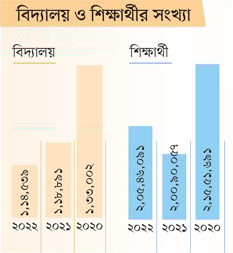 বার্ষিক প্রাথমিক বিদ্যালয় শুমারির তথ্য বলছে, ২০২০ সালে সরকারি ও বেসরকারি (কিন্ডারগার্টেনসহ) প্রাথমিক স্কুল ছিল ১ লাখ ৩৩ হাজার ২টি। ২০২১ সালে কমে হয় ১ লাখ ১৮ হাজার ৮৯১টি। আর ২০২২ সালে তা কমে হয়েছে ১ লাখ ১৪ হাজার ৫৩৯টি; যার মধ্যে সরকারি ৬৫ হাজার ৫৬৬টি। অর্থাৎ দুই বছরের ব্যবধানে প্রাথমিক বিদ্যালয় কমেছে ১৮ হাজার ৪৬৩টি। মূলত কমেছে বেসরকারি প্রাথমিক বিদ্যালয়ই।