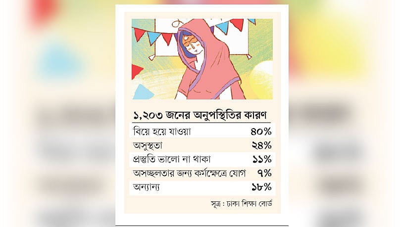 বিয়ে হওয়ার এ হার মেয়ে ও ছেলে মিলিয়ে। এ ছাড়া ৭ শতাংশের বেশি শিক্ষার্থী অনুপস্থিত ছিল পারিবারিক অসচ্ছলতার জন্য কর্মক্ষেত্রে যোগ দেওয়ার কারণে। বাকিরা অসুস্থতা, প্রস্তুতি ভালো না থাকাসহ নানা কারণে পরীক্ষায় অংশ নেয়নি।