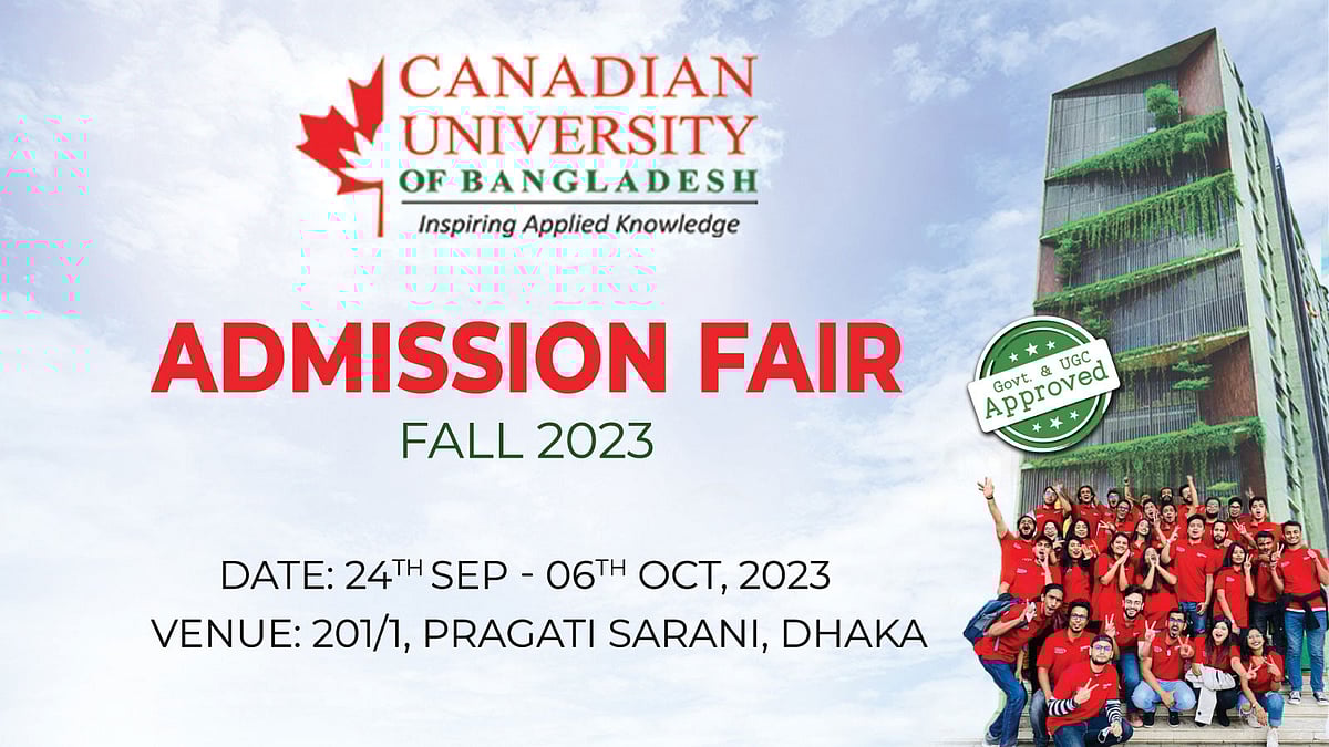 কানাডিয়ান ইউনিভার্সিটি অব বাংলাদেশে (সিইউবি) ফল সেমিস্টার ২০২৩-এ ভর্তি মেলা ২৪ সেপ্টেম্বর থেকে শুরু হয়েছে। মেলা চলবে আগামী ৬ অক্টোবর পর্যন্ত। ভর্তি মেলায় এইচএসসি ও এ লেভেলের শিক্ষার্থীদের জন্য ভর্তি ফি চার হাজার টাকা, ডিপ্লোমাধারী শিক্ষার্থীদের জন্য ভর্তি ফি তিন হাজার টাকা এবং এমবিএ, এক্সিকিউটিভ এমবিএ, মাস্টার্স ইন মেরিটাইম ট্রান্সপোর্টেশন ও লজিস্টিকসের জন্য ভর্তি ফি ছয় হাজার টাকা নির্ধারণ করা হয়েছে।