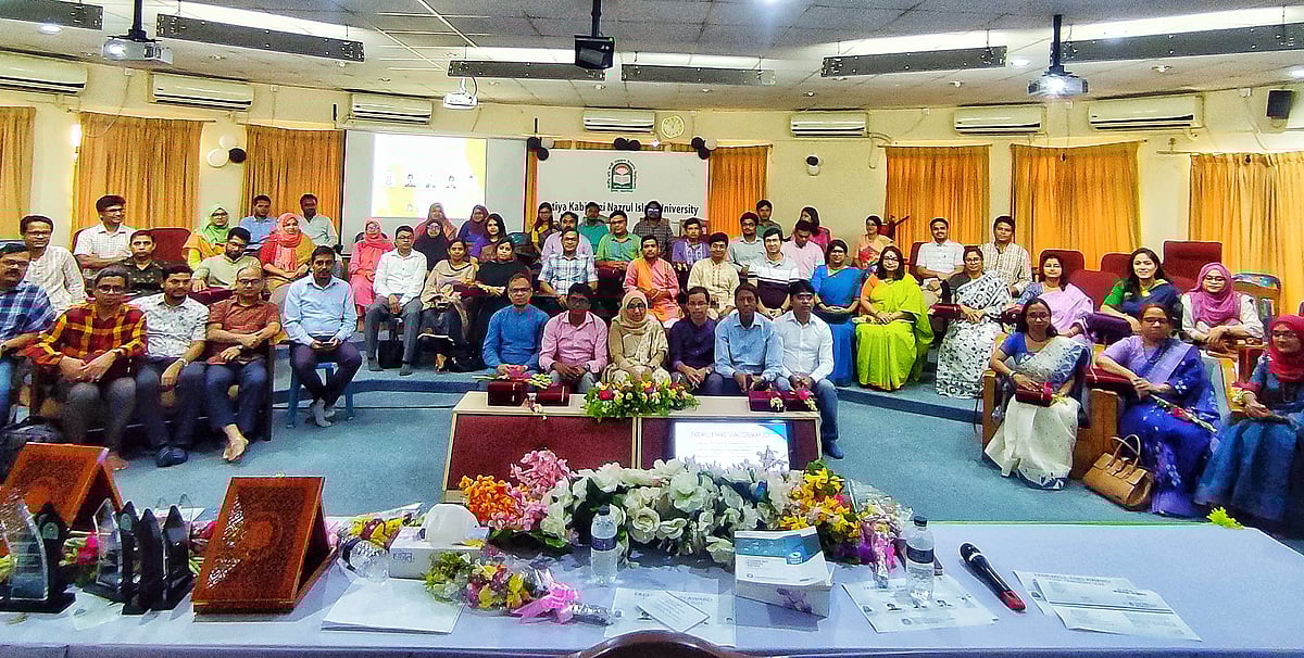 বর্ণাঢ্য আয়োজনের মধ্য দিয়ে জাতীয় কবি কাজী নজরুল ইসলাম বিশ্ববিদ্যালয় শিক্ষক সমিতি আয়োজন করল পিএইচডি, লেখক সম্মাননা ও অবসরপ্রাপ্ত শিক্ষকদের সংবর্ধনা প্রদান অনুষ্ঠান। জাতীয় কবি কাজী নজরুল ইসলাম বিশ্ববিদ্যালয়ের ৪৪ জন পিএইচডি ডিগ্রিপ্রাপ্ত শিক্ষক পিএইচডি সম্মাননা পেয়েছেন। ২০২৪ সালে প্রকাশিত বইয়ের প্রেক্ষিতে লেখক সম্মাননা পেয়েছেন বিশ্ববিদ্যালয়ের পাঁচ শিক্ষক। এ ছাড়া বিশ্ববিদ্যালয় থেকে অবসরপ্রাপ্ত দুই শিক্ষককে সংবর্ধনা প্রদান করা হয়েছে।