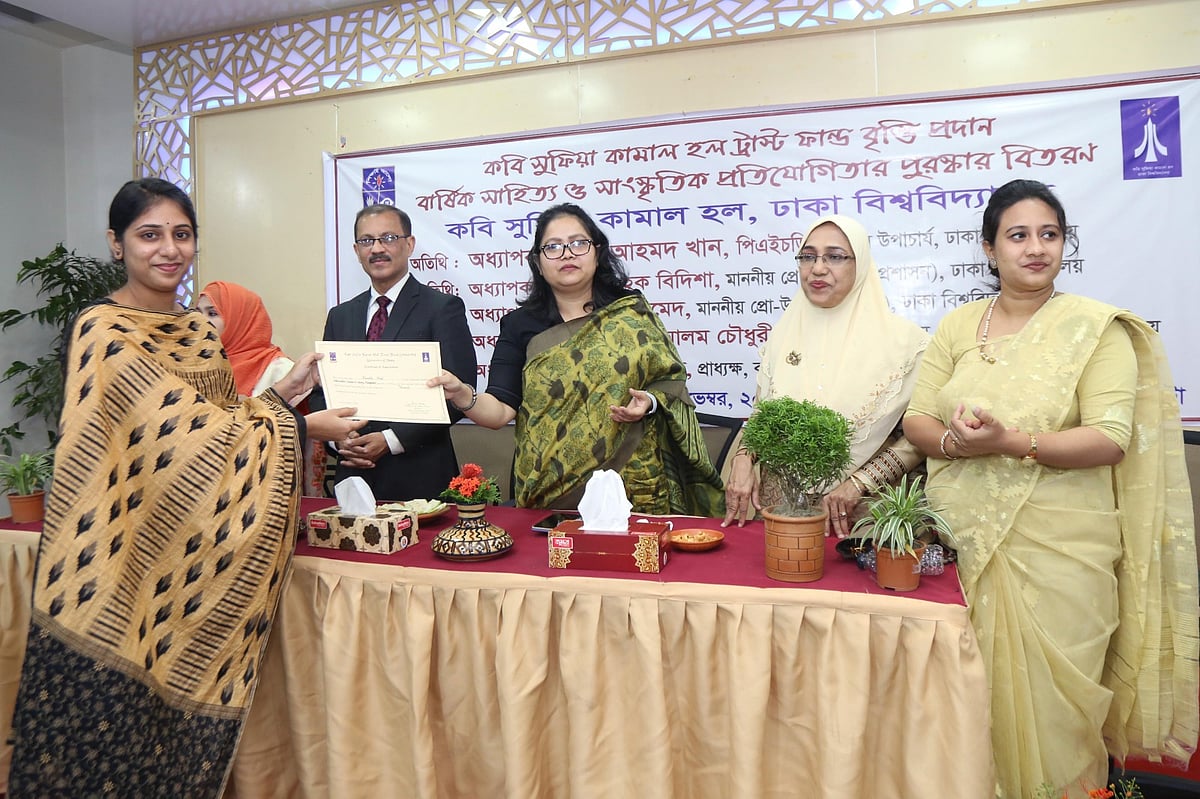 ঢাকা বিশ্ববিদ্যালয়ের উপাচার্য ড. নিয়াজ আহমদ খান ১০ নভেম্বর হল মিলনায়তনে আয়োজিত অনুষ্ঠানে প্রধান অতিথি হিসেবে উপস্থিত থেকে ছাত্রীদের হাতে বৃত্তির চেক তুলে দেন। কবি সুফিয়া কামাল হলের প্রাধ্যক্ষ অধ্যাপক ড. ছালমা নাছরীনের সভাপতিত্বে অনুষ্ঠানে সহ–উপাচার্য (প্রশাসন) ড. সায়মা হক বিদিশা এবং কোষাধ্যক্ষ ড. এম. জাহাঙ্গীর আলম চৌধুরী বিশেষ অতিথি হিসেবে উপস্থিত ছিলেন।