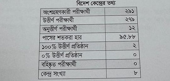 এ বছর দেশের বাইরে আটটি কেন্দ্রে এইচএসসি ও সমমান পরীক্ষা অনুষ্ঠিত হয়েছে। এসব কেন্দ্রে মোট ২৯১ জন পরীক্ষার্থী অংশ নিয়েছিলেন। তাঁদের মধ্যে পাস করেছেন ২৭৯ জন। ফেল করেছেন ১২ জন। সেই হিসাবে গড় পাসের হার ৯৫ দশমিক ৮৮। বিদেশের দুটি কেন্দ্রে শতভাগ পরীক্ষার্থী পাস করেছেন।