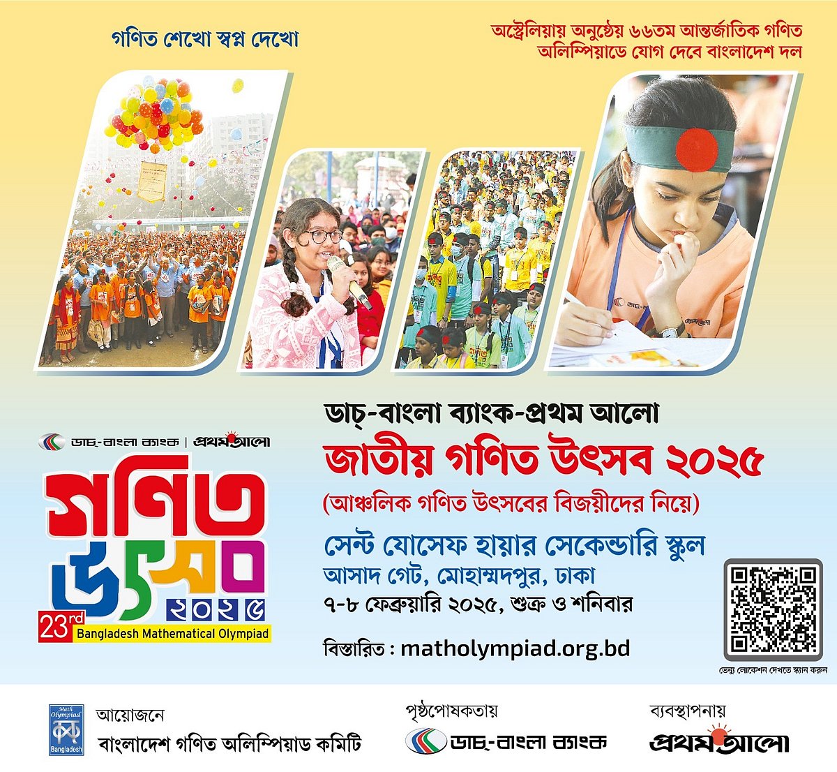 ‘গণিত শেখো, স্বপ্ন দেখো’—এই স্লোগানকে সামনে রেখে ঢাকার সেন্ট যোসেফ হায়ার সেকেন্ডারি স্কুলে ৭–৮ ফেব্রুয়ারি অনুষ্ঠিত হবে দুই দিনব্যাপী ‘ডাচ্-বাংলা ব্যাংক-প্রথম আলো জাতীয় গণিত উত্সব ২০২৫’ ও ‘২৩তম বাংলাদেশ গণিত অলিম্পিয়াড’। ডাচ্-বাংলা ব্যাংক পিএলসি পৃষ্ঠপোষকতায় এবং প্রথম আলোর ব্যবস্থাপনায় বাংলাদেশ গণিত অলিম্পিয়াড কমিটি এই উৎসবের আয়োজন করেছে।