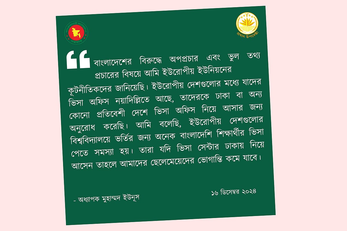 ৫ আগস্টের পর বাংলাদেশের রাজনৈতিক পরিস্থিতির কারণে বাংলাদেশে ভারতীয় ভিসা আবেদন কেন্দ্র (আইভিএসি) অনির্দিষ্টকালের জন্য ভিসা কার্যক্রম স্থগিত রেখেছে। এ কারণে অনেক শিক্ষার্থীই বিপাকে পড়ছেন। পর্তুগাল, বুলগেরিয়া, রোমানিয়া, লিথুয়ানিয়া, হাঙ্গেরি, অস্ট্রিয়াসহ ইউরোপের বিভিন্ন দেশের দূতাবাস বাংলাদেশে নেই। তাই এসব দেশে পড়তে যেতে চাইলে শিক্ষার্থীদের নিকটবর্তী দেশ ভারতে গিয়ে ভিসা সাক্ষাৎকার দিতে হয়। ইইউর কূটনীতিকদের এ সমস্যার কথা জানিয়েছেন বলে আজ সোমবার ‘Chief Adviser GOB’ নামের ভেরিফায়েড ফেসবুক পোস্টে জানিয়েছেন প্রধান উপদেষ্টা।