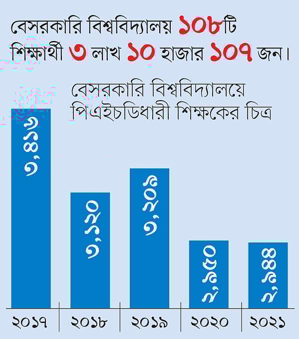 বর্তমানে দেশে ১০৮টি বেসরকারি বিশ্ববিদ্যালয় আছে। এর মধ্যে ছয়টির কার্যক্রম শুরু হয়নি। বেসরকারি বিশ্ববিদ্যালয়গুলোতে মোট শিক্ষক আছেন ১৫ হাজার ৩৯৩ জন। এর মধ্যে পূর্ণকালীন শিক্ষক ৭৮ শতাংশ। বিশ্ববিদ্যালয় মঞ্জুরি কমিশনের (ইউজিসি) ২০১৭ সাল থেকে ২০২১ সালের তথ্য পর্যালোচনা করে দেখা গেছে, কেবল ২০১৯ সালে তার আগের বছরের তুলনায় পিএইচডি ডিগ্রিধারী শিক্ষকের সংখ্যা কিছুসংখ্যক বেড়েছিল।