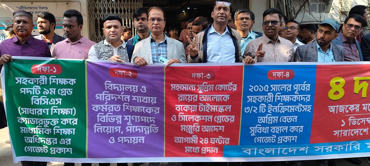 সরকারি মাধ্যমিক বিদ্যালয়ের শিক্ষকদের প্রবেশ পদ সহকারী শিক্ষক পদটি বিসিএস ক্যাডারভুক্ত করাসহ চার দফা দাবিতে আগামীকাল সোমবার (১ ডিসেম্বর ২০২৫) থেকে পূর্ণ দিবস কর্মবিরতিতে যাচ্ছেন শিক্ষকেরা। কর্মবিরতির অংশ হিসেবে তাঁরা চলমান বার্ষিক পরীক্ষাও বন্ধ রাখবেন। ২৪ নভেম্বর থেকে বার্ষিক পরীক্ষা শুরু হয়েছে।