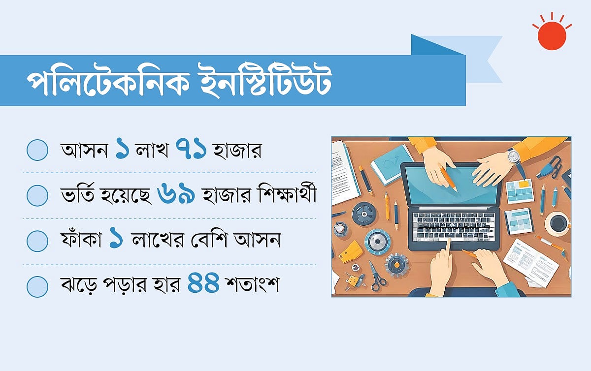 দেশের কারিগরি শিক্ষা যতটা শিক্ষার্থী পাওয়ার কথা, ততটা পাচ্ছে না। দেশে সরকারি–বেসরকারি পলিটেকনিক ইনস্টিটিউটে ডিপ্লোমা ইন ইঞ্জিনিয়ারিংয়ে আসন আছে ১ লাখ ৭১ হাজারের বেশি। অথচ ২০২৩-২৪ অর্থবছরে ভর্তি হয়েছেন মাত্র ৬৯ হাজার শিক্ষার্থী, অর্থাৎ এক লাখের বেশি আসন ফাঁকা আছে। এর অধিকাংশই বেসরকারি প্রতিষ্ঠানের। আসন ফাঁকা আছে সরকারি প্রতিষ্ঠানেও।
